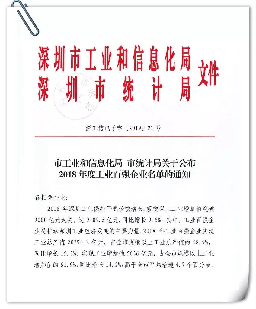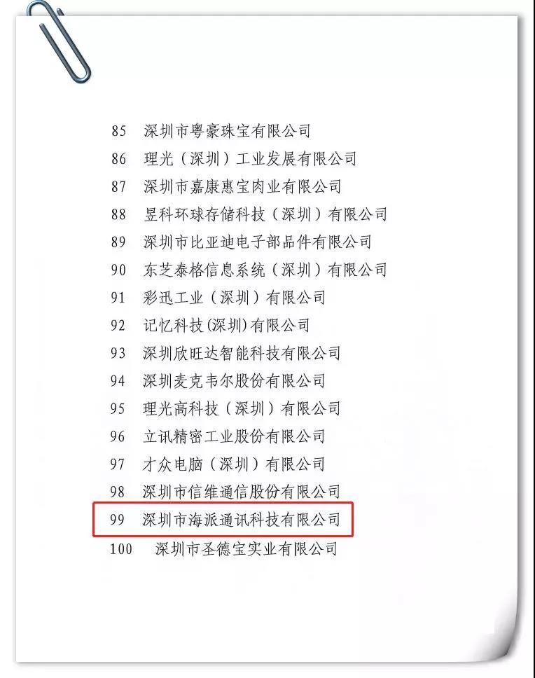 深圳市工業(yè)和信息化局、深圳市統(tǒng)計局經(jīng)過嚴格的分析統(tǒng)計評選,于近日聯(lián)合公布了2018年度深圳市工業(yè)百強企業(yè),深圳海派得以榮登榜單。