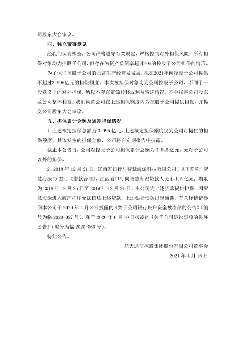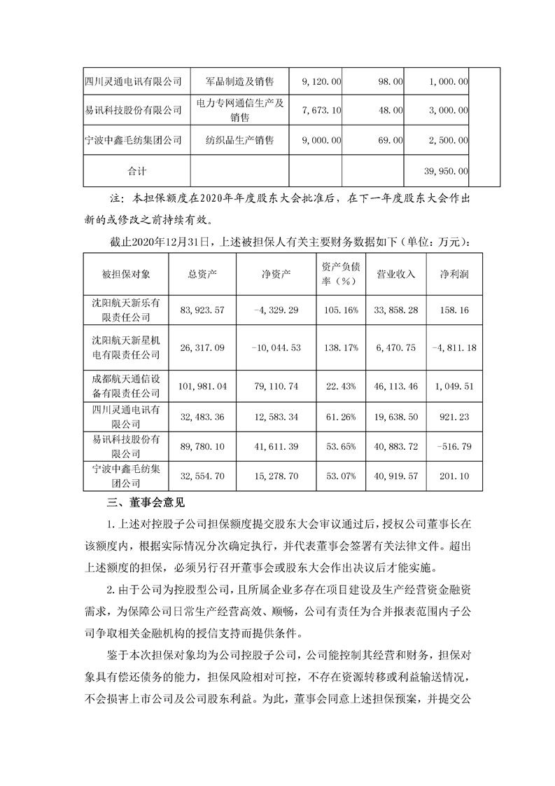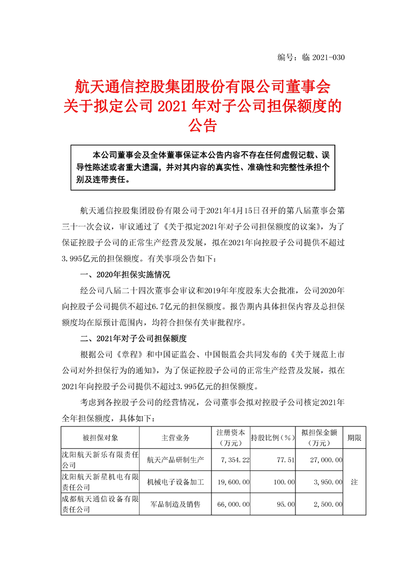 航天通信控股集團股份有限公司關于擬定公司2021年對子公司擔保額度的公告