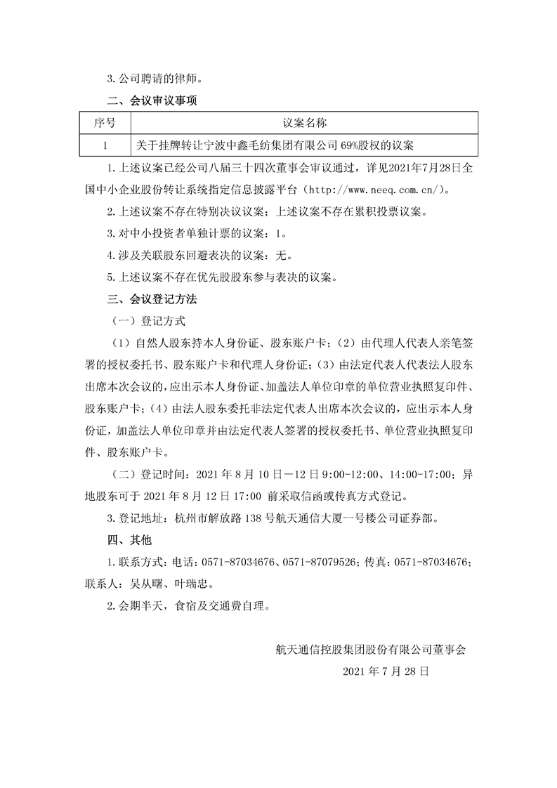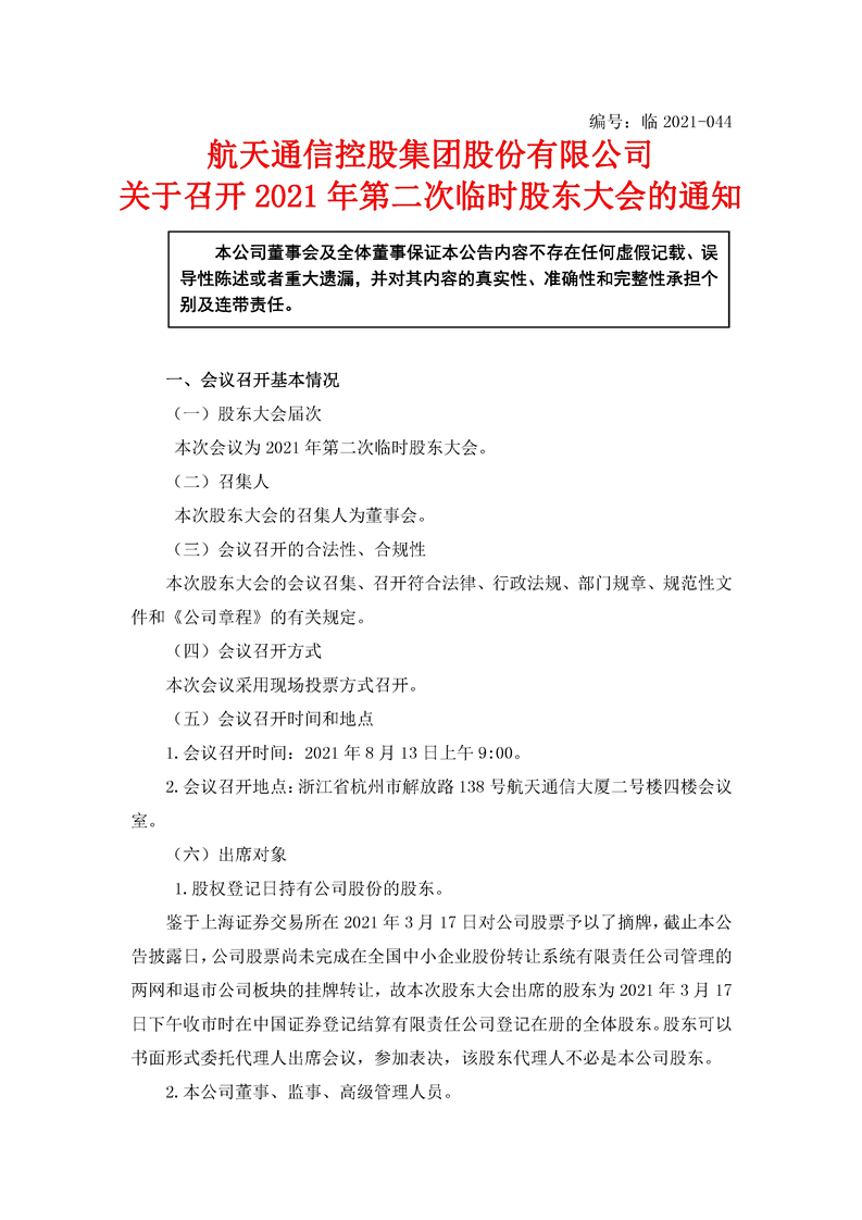 航天通信控股集團(tuán)股份有限公司關(guān)于召開(kāi)2021年第二次臨時(shí)股東大會(huì)的通知