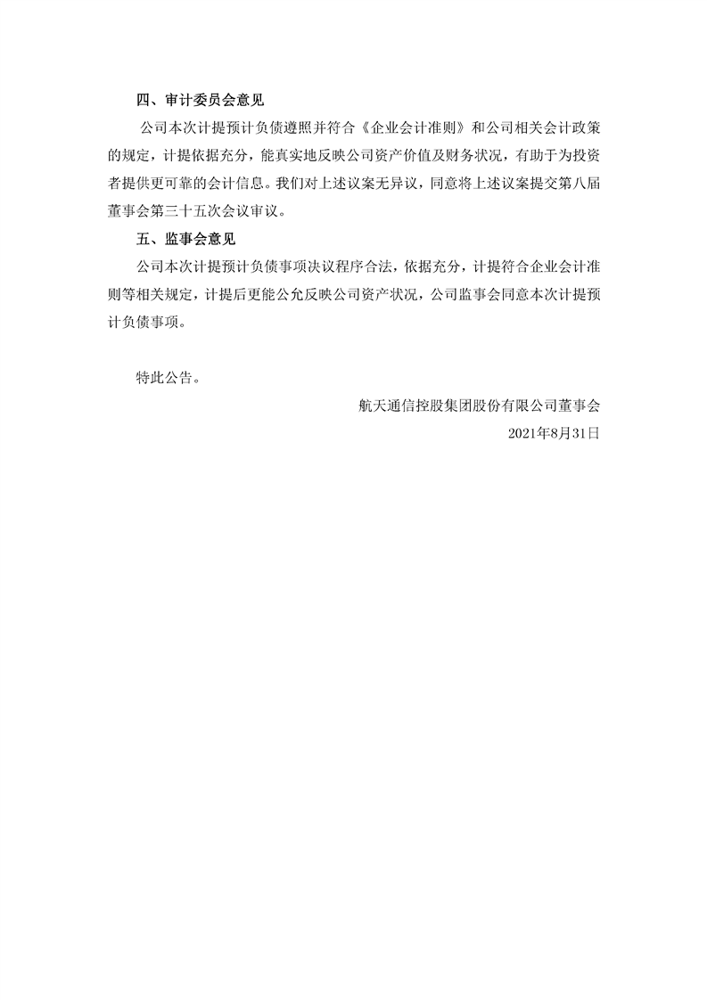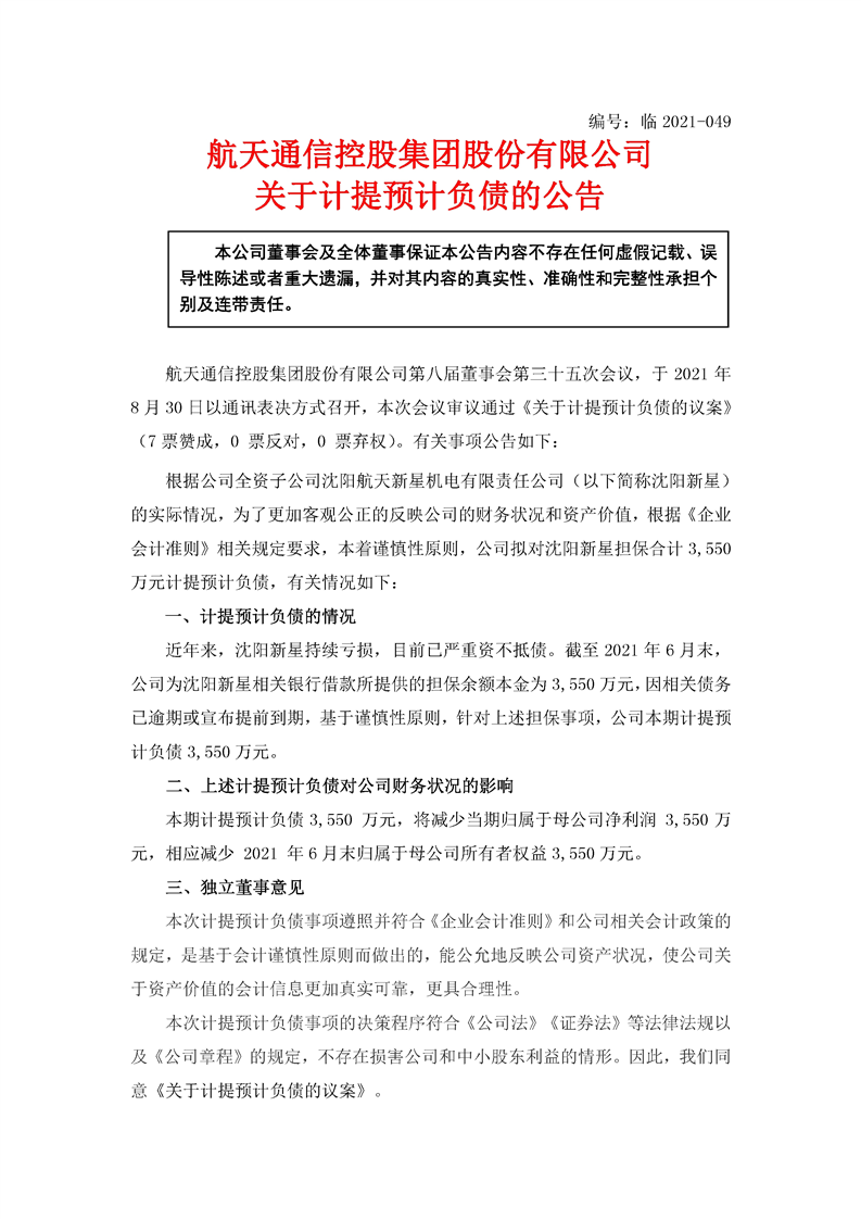 航天通信控股集團(tuán)股份有限公司關(guān)于計(jì)提預(yù)計(jì)負(fù)債的公告